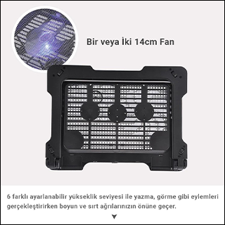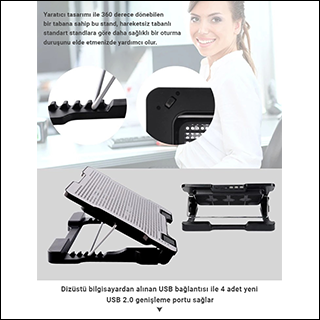 Teknik özellikler» Güçlendirilmiş Alüminyum alaşım yapı » 6 farklı yükseklik seviyesi » 4 adet USB 2.0 genişleme portu » 14cm iki adet fan » 360 derece döndürülebilir taban » Kolay katlanır tasarım