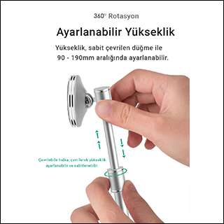 Teknik özellikler» Güçlendirilmiş Alüminyum alaşım yapı » Kayma önleyen silikon pedler » 90—190mm ayarlanabilir yükseklik » Birden fazla ayarlanabilir açı » Manyetik kavrama » Ağırlaştırılmış taban » Kalın destek kolu